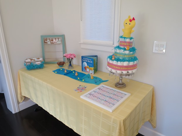 The favor table before I added the duck boot vase and duck pond decorations. On the left is a mini candy bar and on the right, each guest gets to take home a duck soap.